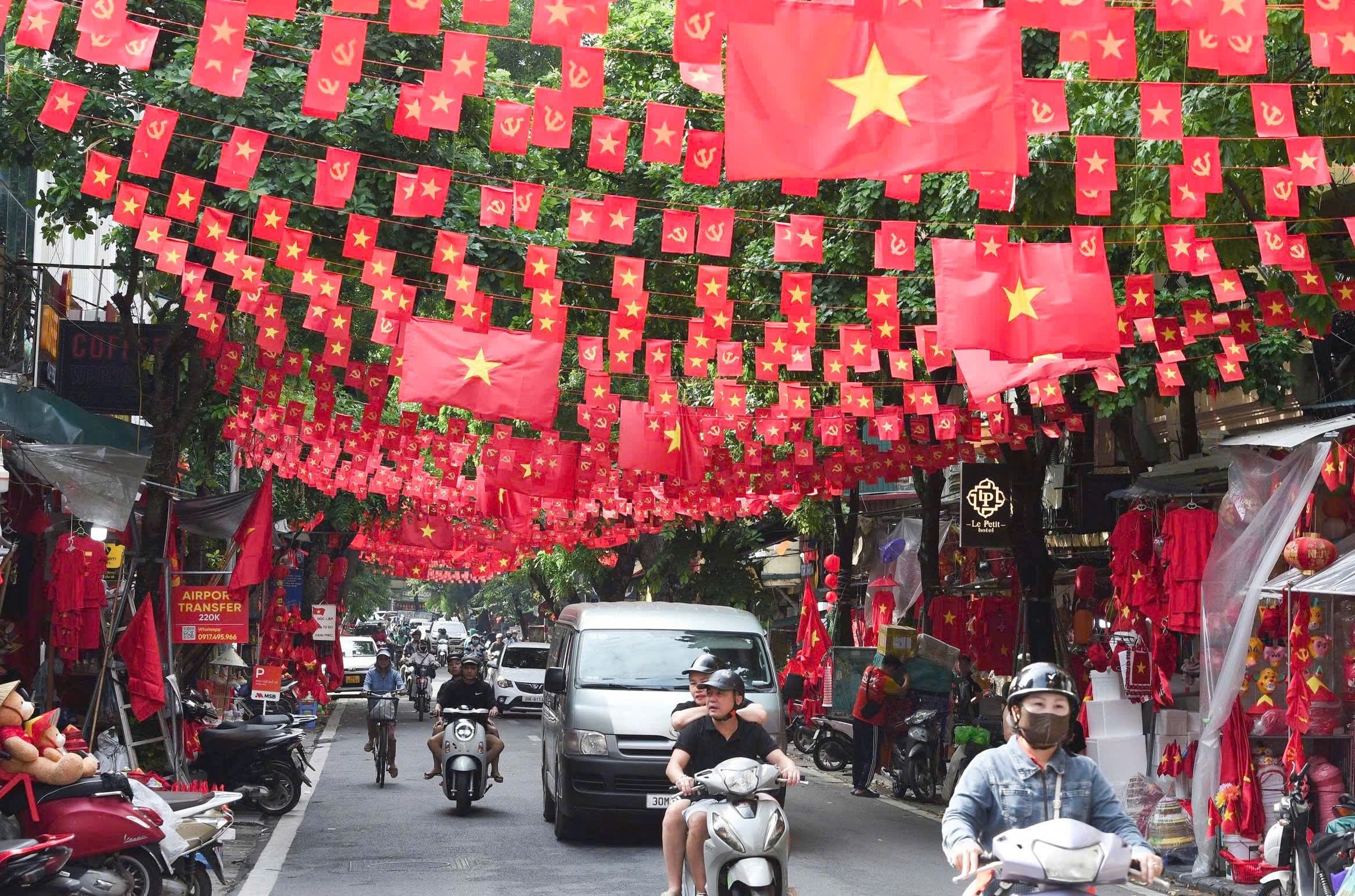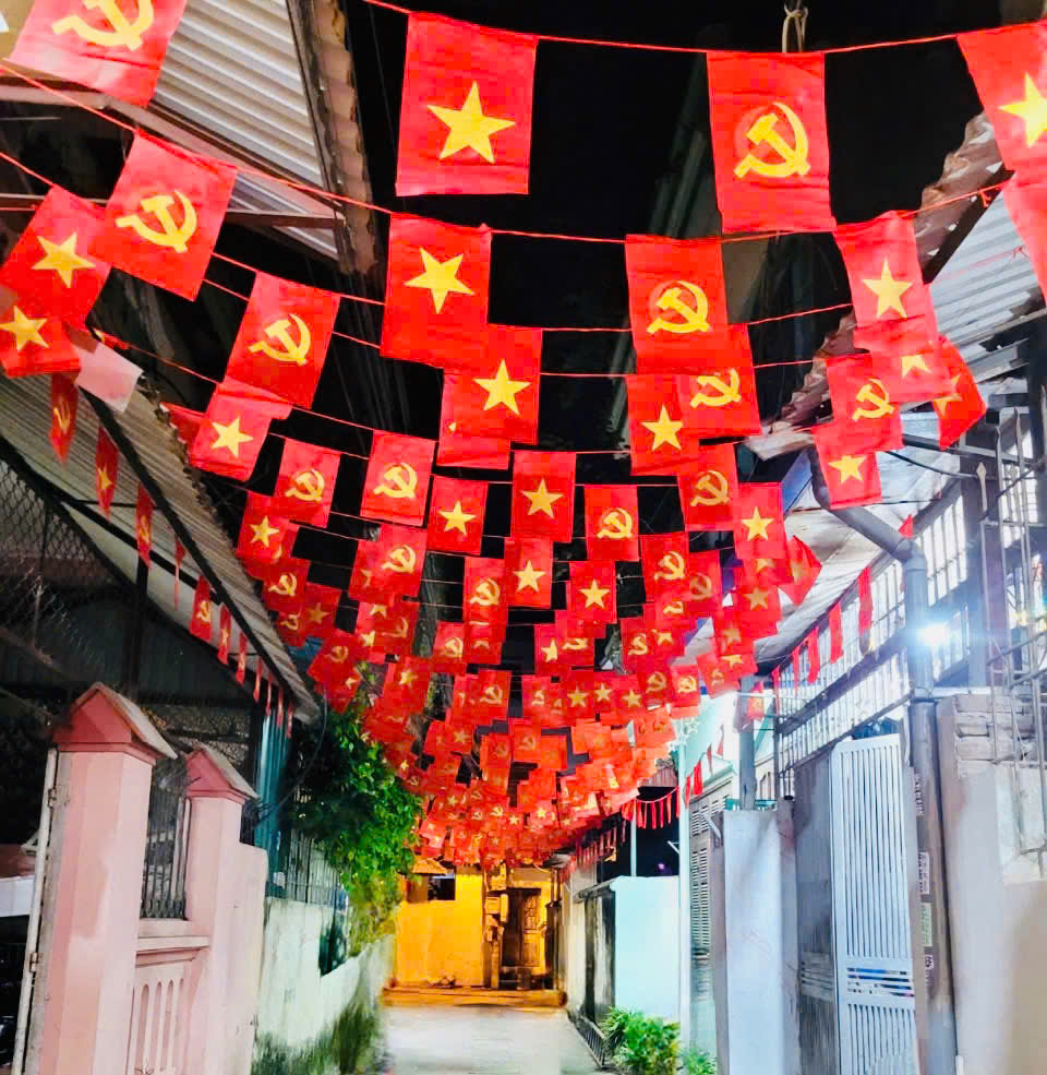 Dây cờ Tổ Quốc giúp không gian trang trí thêm rực rỡ và đậm tinh thần dân tộc.