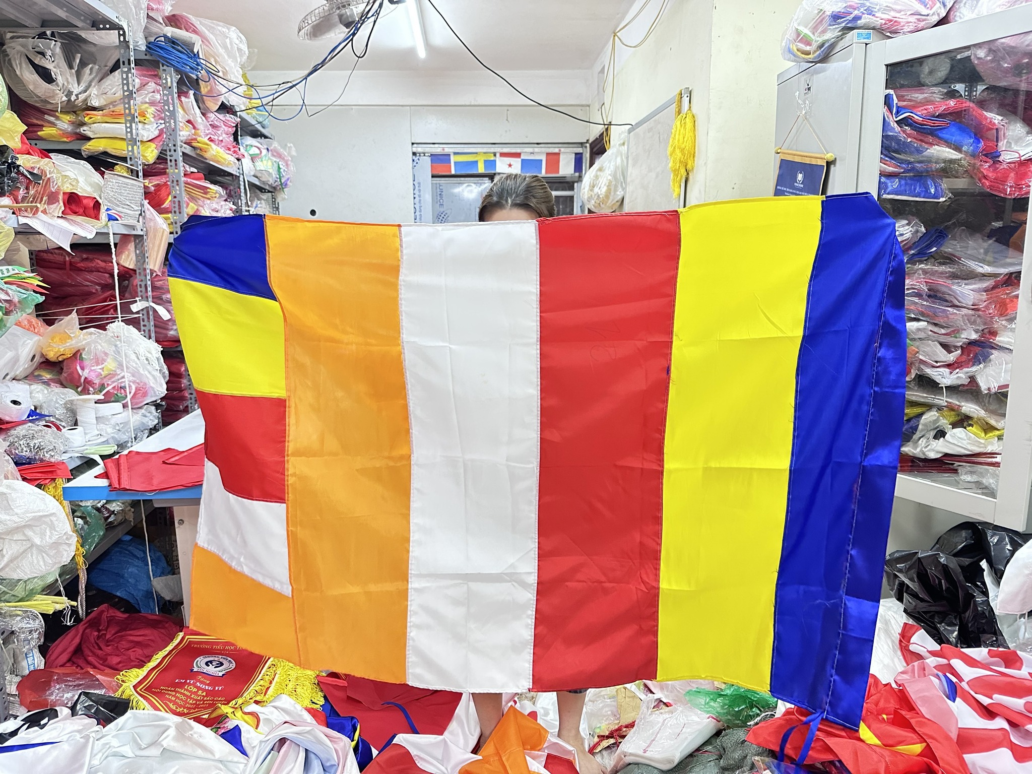 Hình ảnh cờ Phật giáo trang nghiêm do xưởng may cờ Hoàng Gia sản xuất trực tiếp tại Hà Nội.