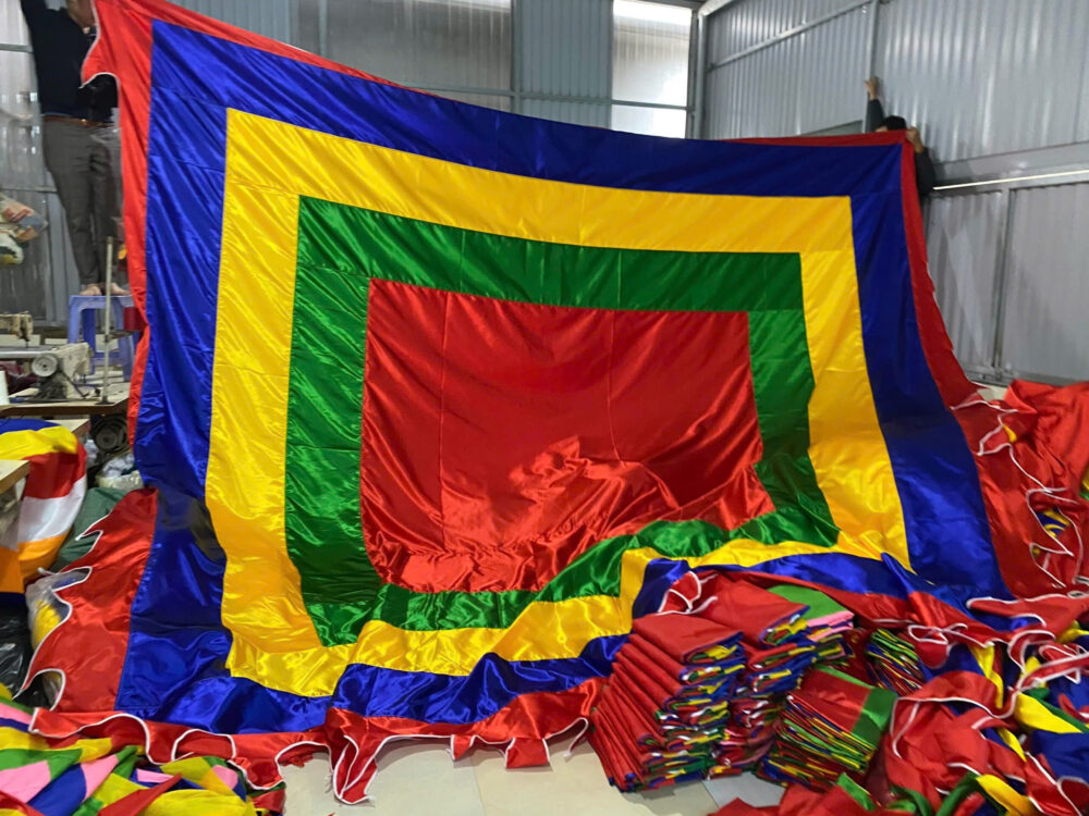 Hình ảnh cờ Thần ngũ sắc may thủ công, đường viền sắc sảo, được xưởng Hoàng Gia chăm chút từng chi tiết.