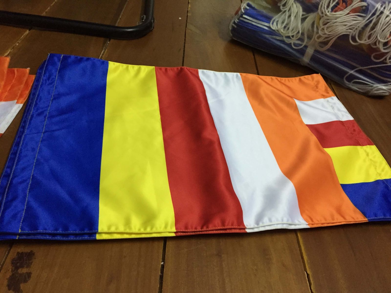 Cờ Phật 6 màu chuẩn được may tại xưởng, đáp ứng các nghi lễ và sự kiện Phật giáo.