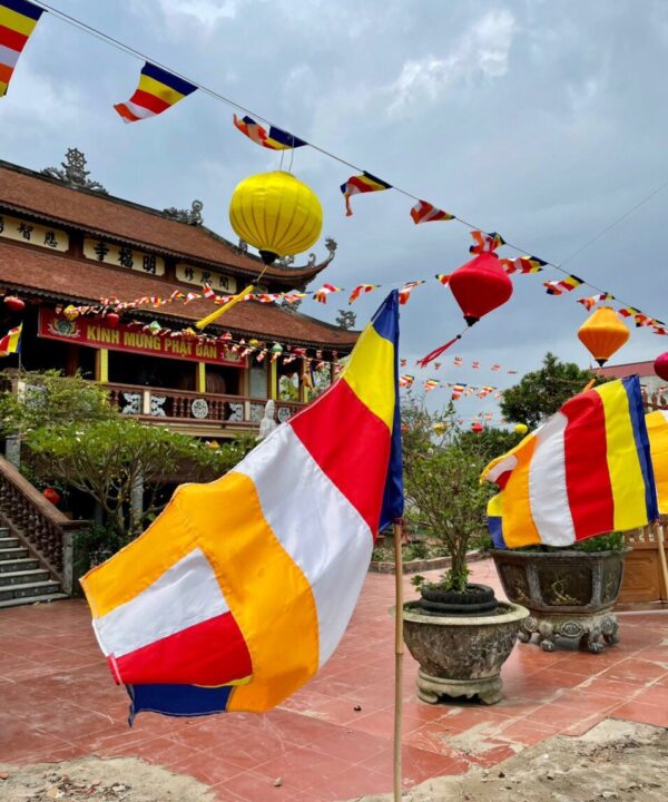 Hình ảnh cờ Phật giáo treo dọc sân chùa trong các dịp lễ lớn.